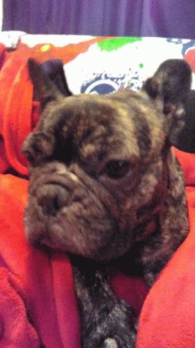 Paglalarawan ng Content: a dog laying on a red blanket with a purple background