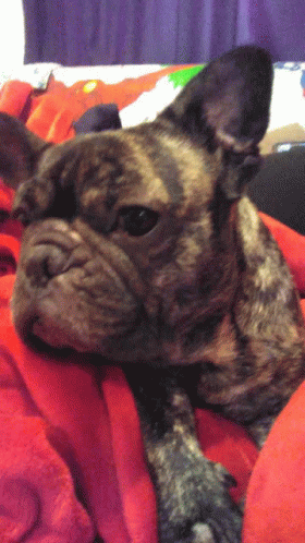 Paglalarawan ng Content: a dog laying on a red blanket with a purple curtain in the background