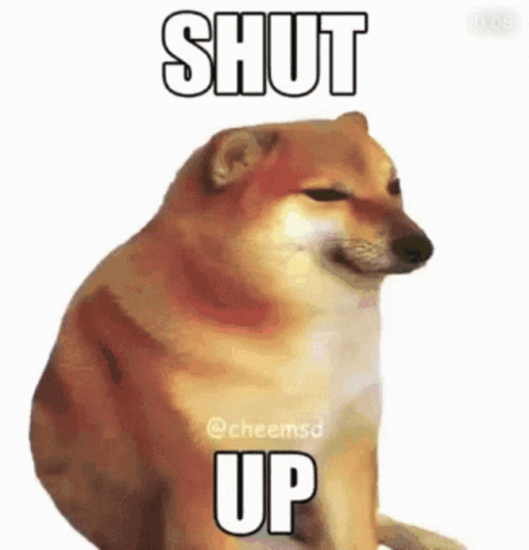 Paglalarawan ng Content: a cheems dog is sitting down with the words `` shut up '' written above it .