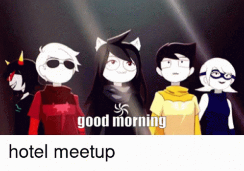 Paglalarawan ng Content: a group of cartoon characters with the words good morning hotel meetup
