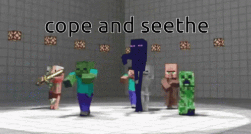 Paglalarawan ng Content: a group of minecraft characters are dancing in a room with the words cope and seethe written above them