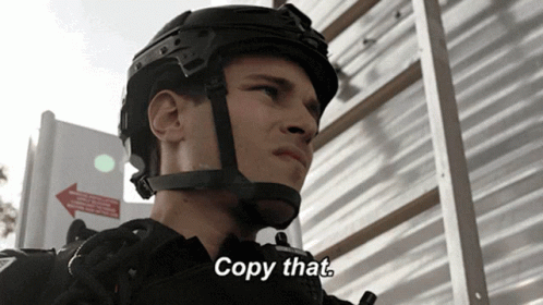 Paglalarawan ng Content: a man in a helmet says copy that in front of a building