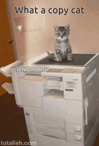 Paglalarawan ng Content: a cat is sitting on top of a copy machine with the text what a copy cat < android