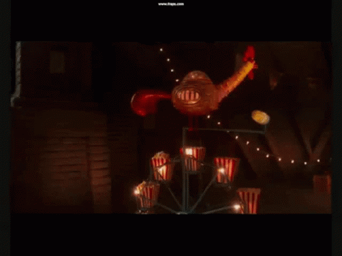 Paglalarawan ng Content: a cartoon character is standing next to a carousel with popcorn and a chicken balloon .