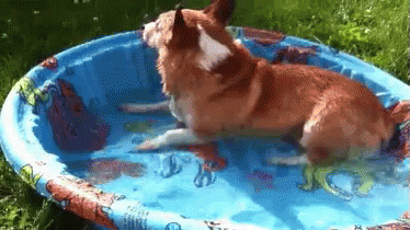 Paglalarawan ng Content: a brown and white dog is laying in a blue pool