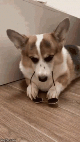 Paglalarawan ng Content: a brown and white corgi dog wearing sunglasses is laying on the floor .