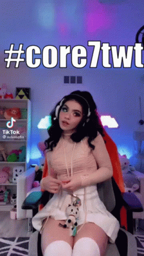 Paglalarawan ng Content: a girl wearing headphones and knee high socks is sitting in a chair with # core7twt written on the bottom