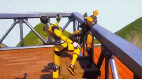 Paglalarawan ng Content: a couple of yellow robots are standing on top of a wooden platform on a bridge .