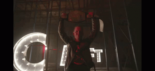 Paglalarawan ng Content: a man holding a wrestling championship belt in front of a sign that says clt