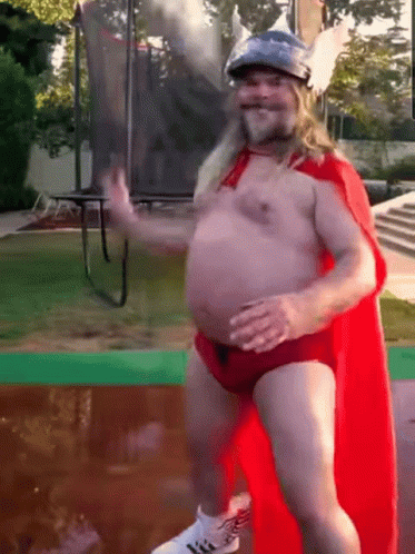 Paglalarawan ng Content: a shirtless man in a red cape and a helmet is dancing in front of a trampoline