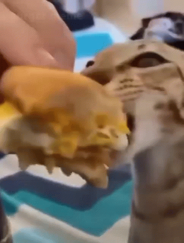 Paglalarawan ng Content: a close up of a person holding a hamburger with a cat eating it .