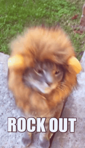 Paglalarawan ng Content: a cat wearing a lion costume with the words rock out above it