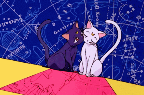 Paglalarawan ng Content: two cats are sitting on a pink rug in front of a constellation map that says gestrinus