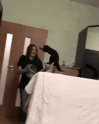 Paglalarawan ng Content: a woman is standing next to a bed while a cat stands on its hind legs .