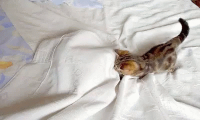 Paglalarawan ng Content: a kitten laying on a bed with a white blanket on it