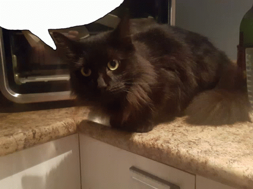Paglalarawan ng Content: a black cat is laying on a counter with a speech bubble above it