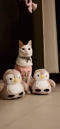 Paglalarawan ng Content: a cat sitting next to two stuffed penguins on the floor