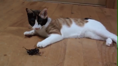 Paglalarawan ng Content: a cat laying on a wooden floor playing with a bug