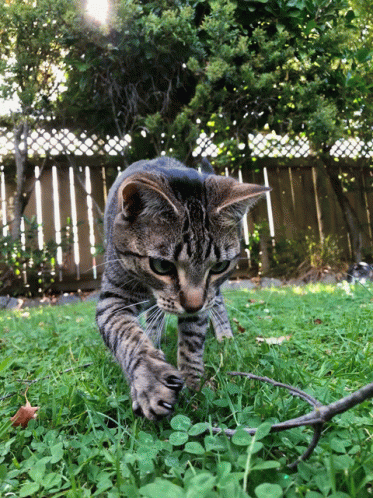 Paglalarawan ng Content: a cat playing with a stick in the grass in front of a fence