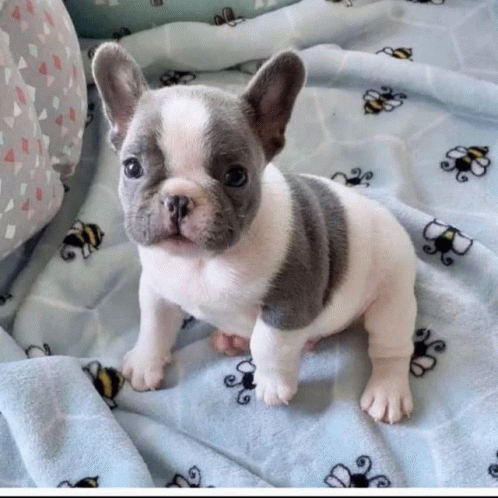 Paglalarawan ng Content: a small puppy laying on a blanket with bees on it