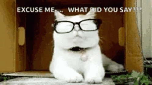Paglalarawan ng Content: a white cat wearing glasses is sitting in a cardboard box and asking what did you say .