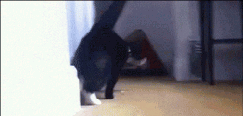 Paglalarawan ng Content: a black cat is standing on its hind legs on a wooden floor .