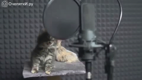 Paglalarawan ng Content: a kitten is sitting in front of a microphone with its mouth open