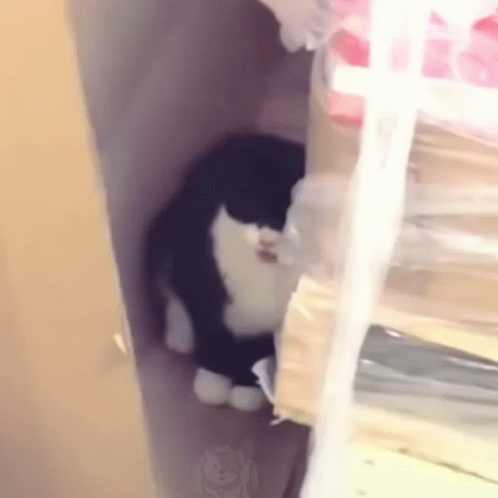 Paglalarawan ng Content: a black and white cat is sitting in a box