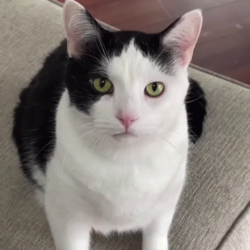 Paglalarawan ng Content: a black and white cat sitting on a couch looking up at the camera