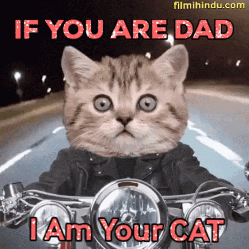 Paglalarawan ng Content: a cat is riding a motorcycle with the words if you are dad i am your cat