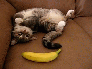 Paglalarawan ng Content: a cat is laying on its back on a couch next to a banana
