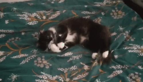 Paglalarawan ng Content: a black and white cat laying on a green blanket with flowers on it