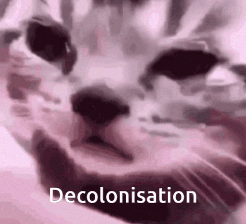 Paglalarawan ng Content: a close up of a cat 's face with the words decolonisation written in the corner .