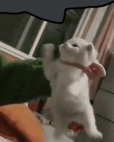 Paglalarawan ng Content: a white cat wearing a pink collar is standing on its hind legs in front of a window .