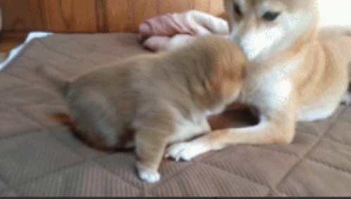 Paglalarawan ng Content: a dog and a puppy are playing on a blanket on the floor