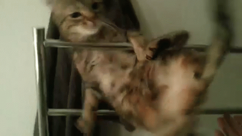 Paglalarawan ng Content: a cat is playing with a towel rack and looking at the camera .
