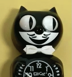 Paglalarawan ng Content: a black cat with a bow tie and a clock that says kit cat