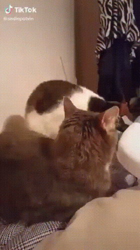 Paglalarawan ng Content: two cats are laying next to each other on a bed and one of them is looking at the camera .