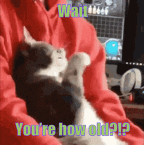 Paglalarawan ng Content: a person holding a cat with the words " you 're how old ? "