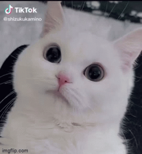 Paglalarawan ng Content: a white cat with big eyes and a pink nose is laying down and looking at the camera .
