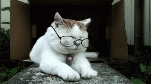 Paglalarawan ng Content: a white and brown cat wearing glasses is laying on a rock .