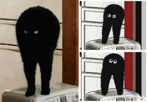 Paglalarawan ng Content: a black cat standing on top of a washing machine next to a pixelated image of the same cat