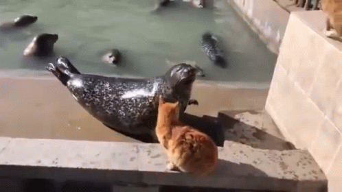 Paglalarawan ng Content: a cat is standing next to a seal in a pool .