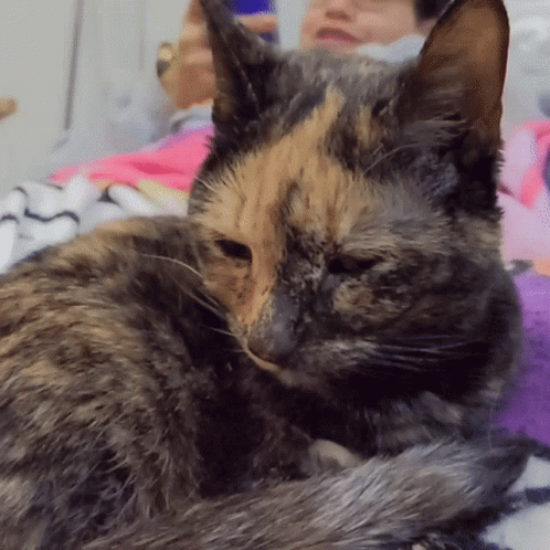 Paglalarawan ng Content: a calico cat is laying on a blanket with a woman behind it