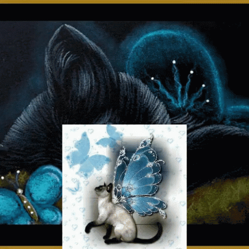 Paglalarawan ng Content: a cat with a blue butterfly on its back sits in front of a blue flower