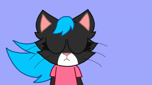 Paglalarawan ng Content: a black cat with blue hair is wearing a pink shirt and has its eyes closed