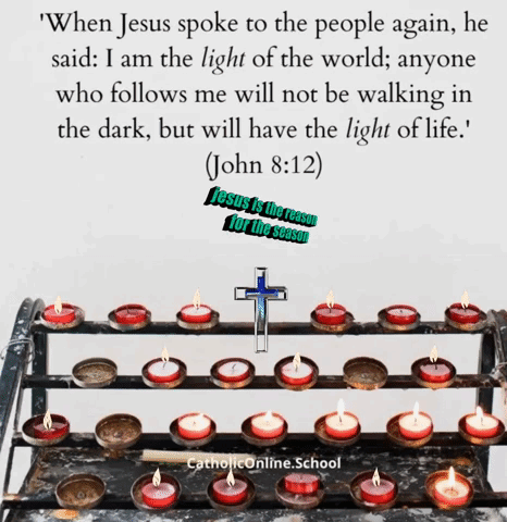 Paglalarawan ng Content: a display of candles with a quote from john 8:12 on top