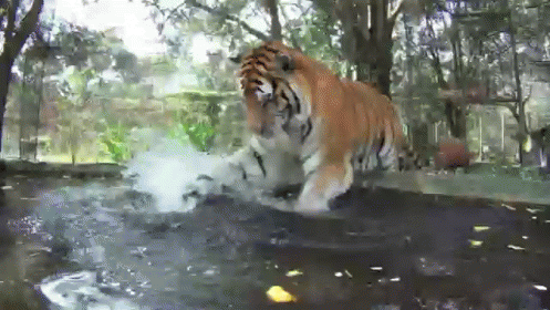 Paglalarawan ng Content: a tiger is jumping into a body of water with trees in the background