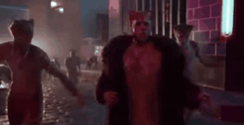 Paglalarawan ng Content: a man in a fur coat and a bloody mask is walking down a street with zombies .