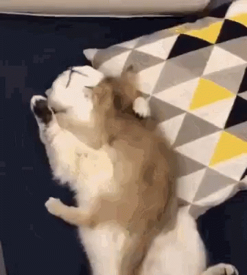Paglalarawan ng Content: two cats are laying on top of each other on a couch with pillows .